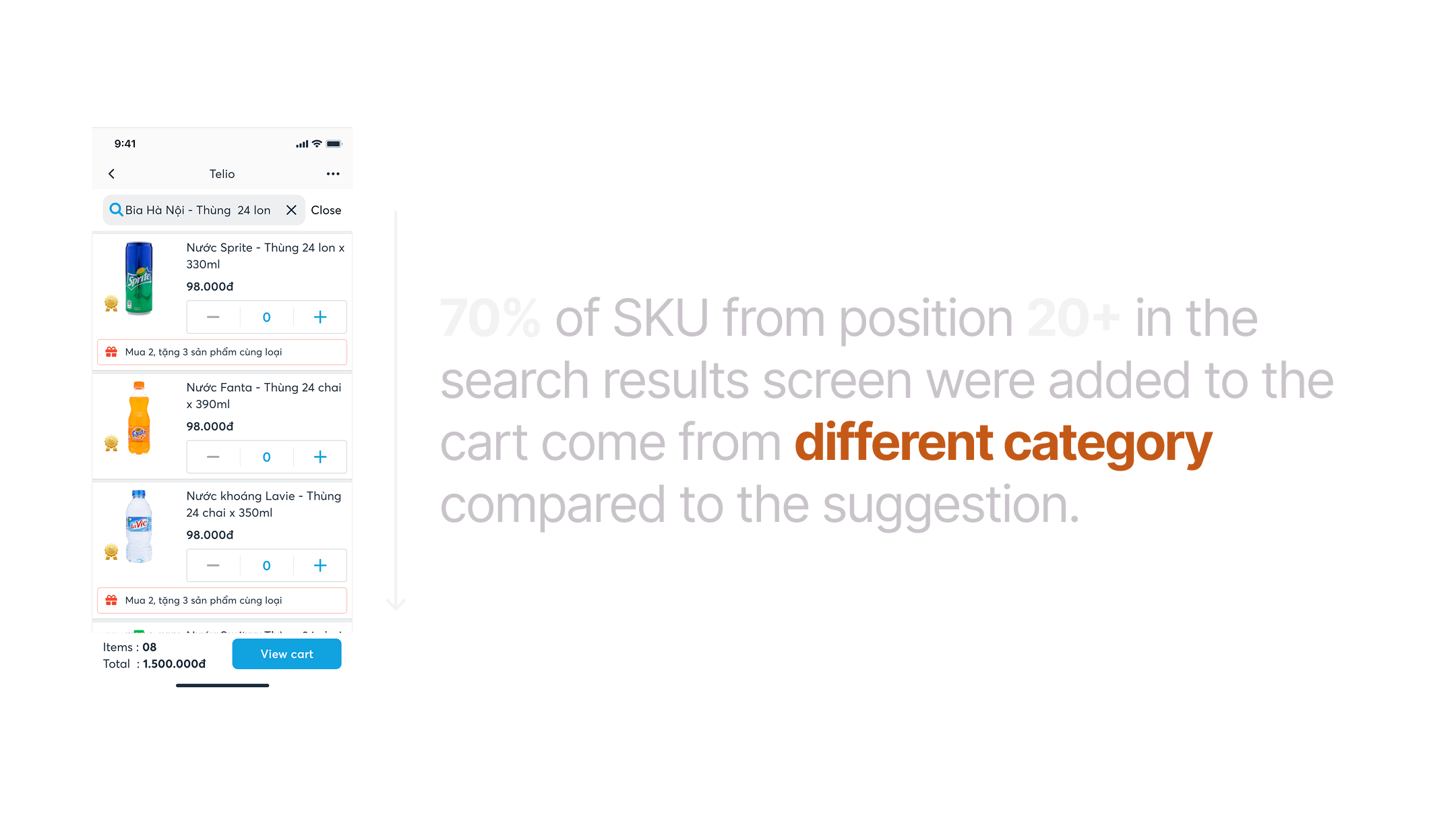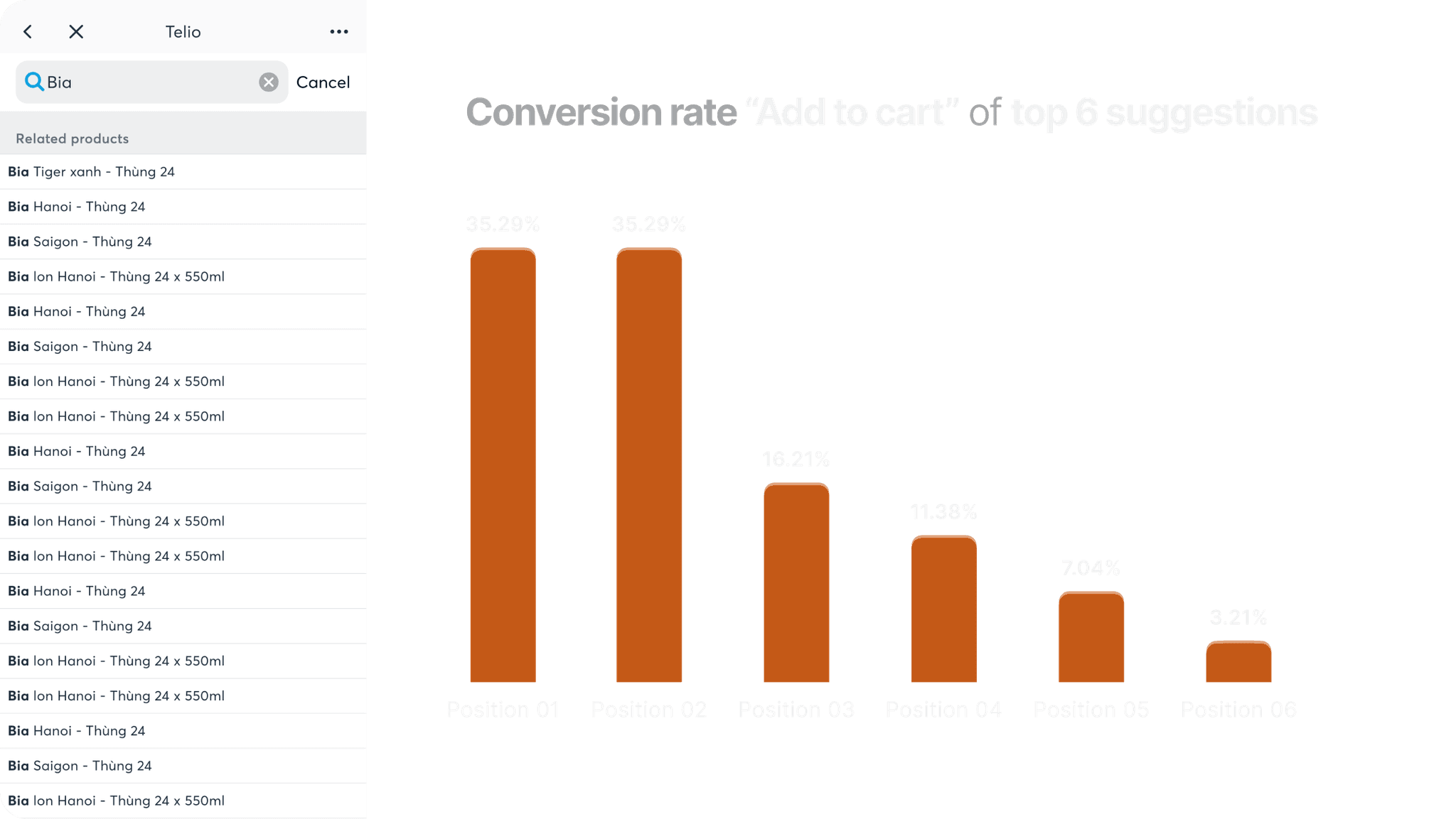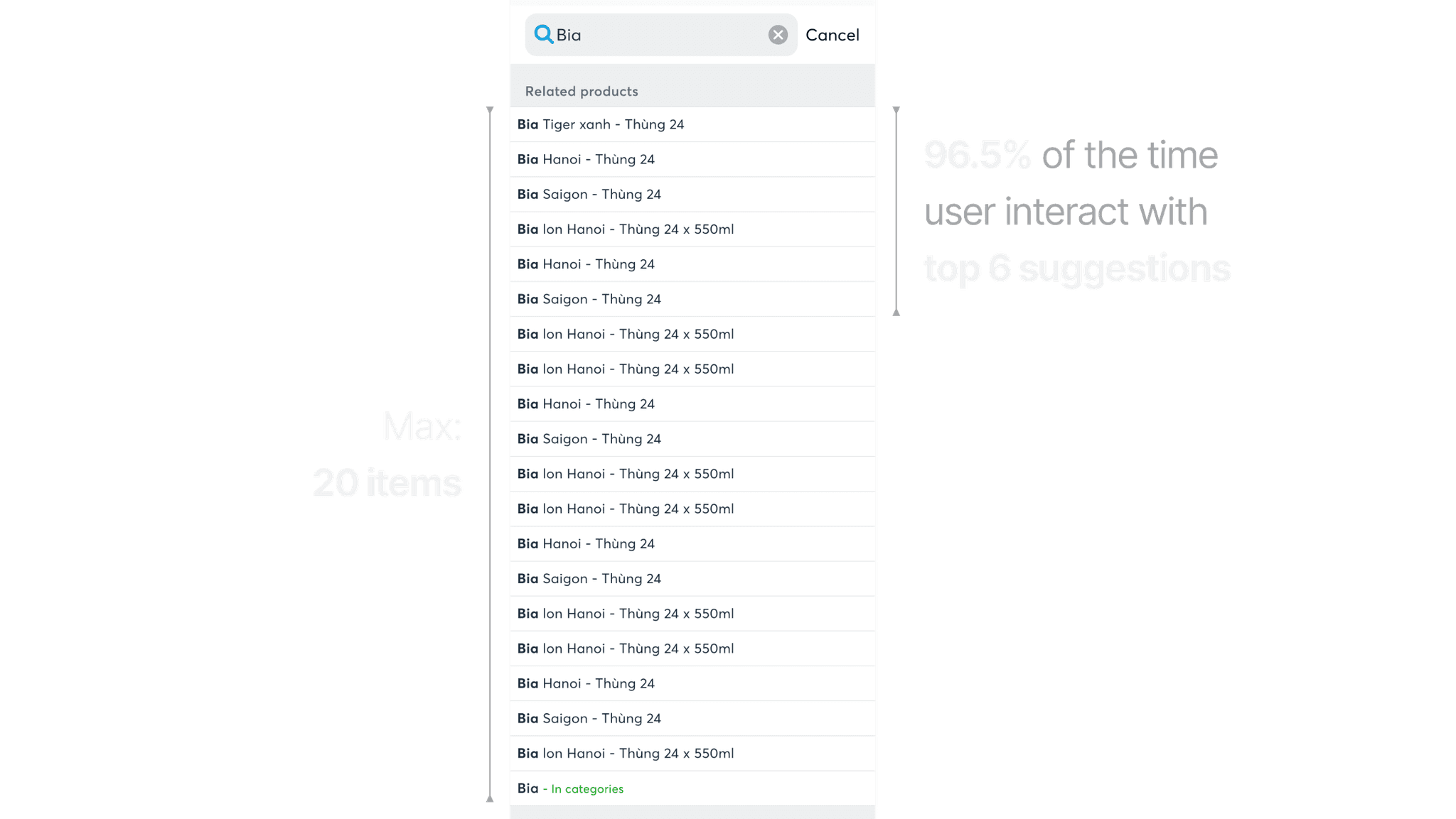 Customers only need the first 6 results to find the product they want. Among them, the first 2 suggestions accounted for 70%
